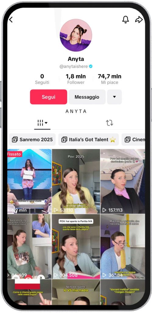 Anyta, (@anytaishere), creator amatissima dalla Gen Z, conta oltre 2 milioni di follower, 75 milioni di like e centinaia di milioni di visualizzazioni su TikTok e Instagram. Conosciuta per le sue canzoni virali e per la sua partecipazione a Italia’s Got Talent, ha conquistato il pubblico con uno stile leggero, diretto e inclusivo. Parla ai ragazzi con il loro stesso linguaggio, creando contenuti autentici e vicini alla loro quotidianità.